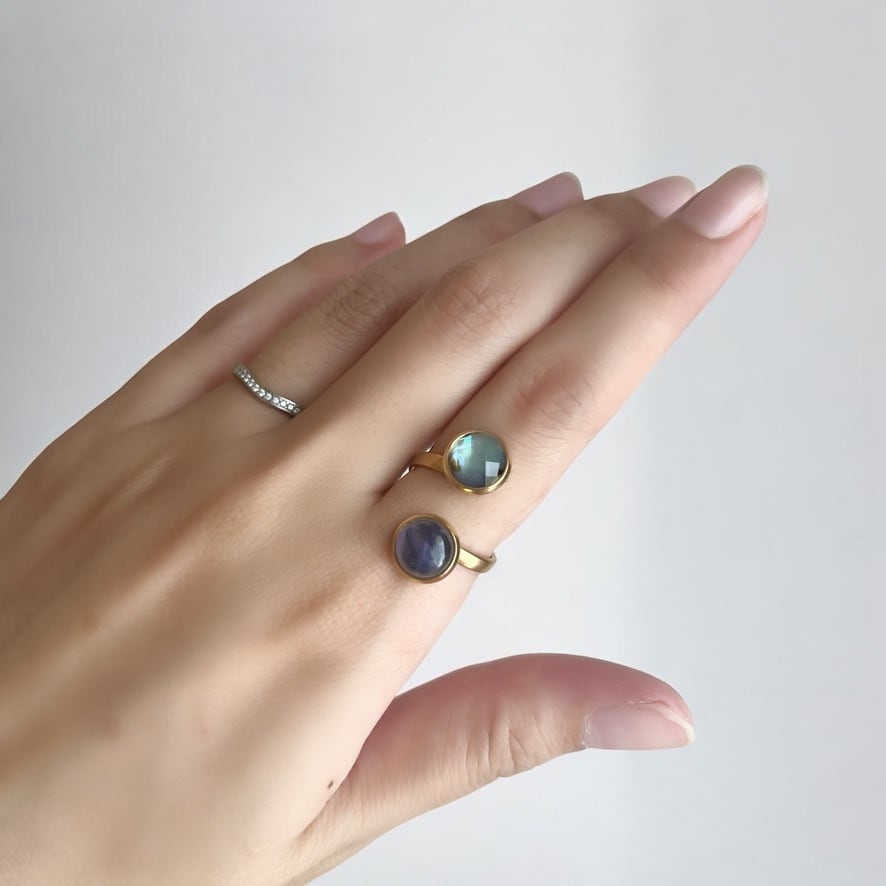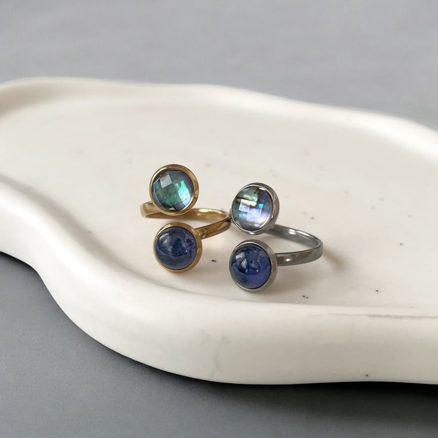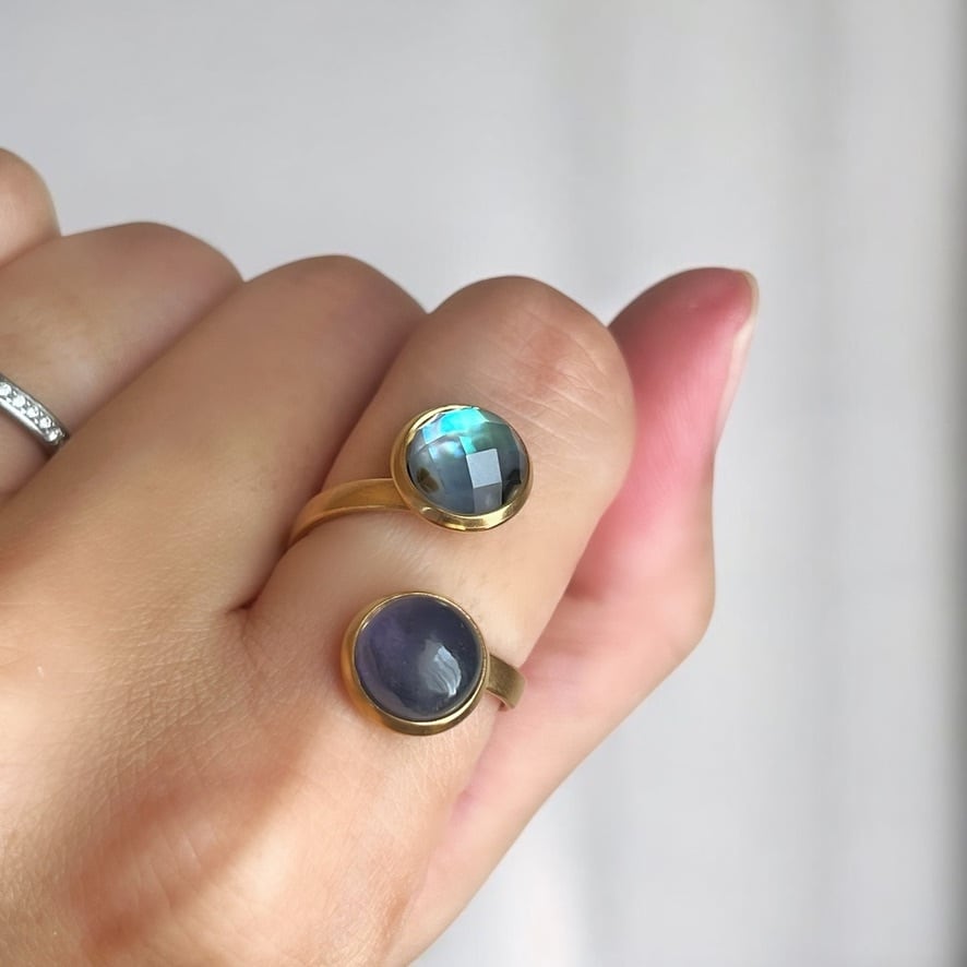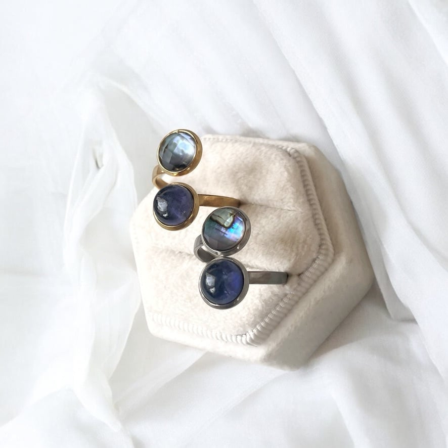 【JORIE】大人のシックカラー❤️ アバロンシェル×アイオライ DOUBLE STONE リング 宇宙の輝き